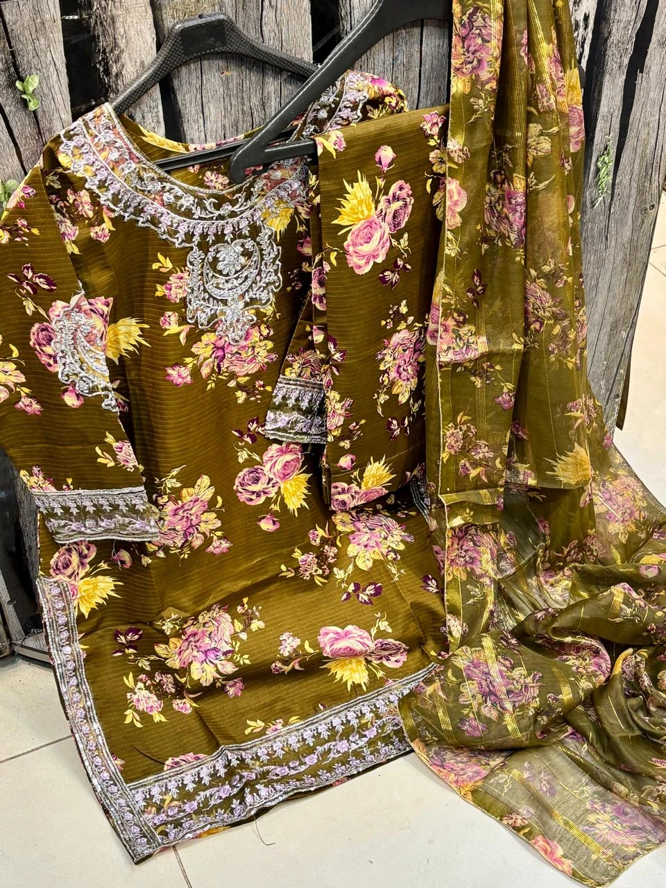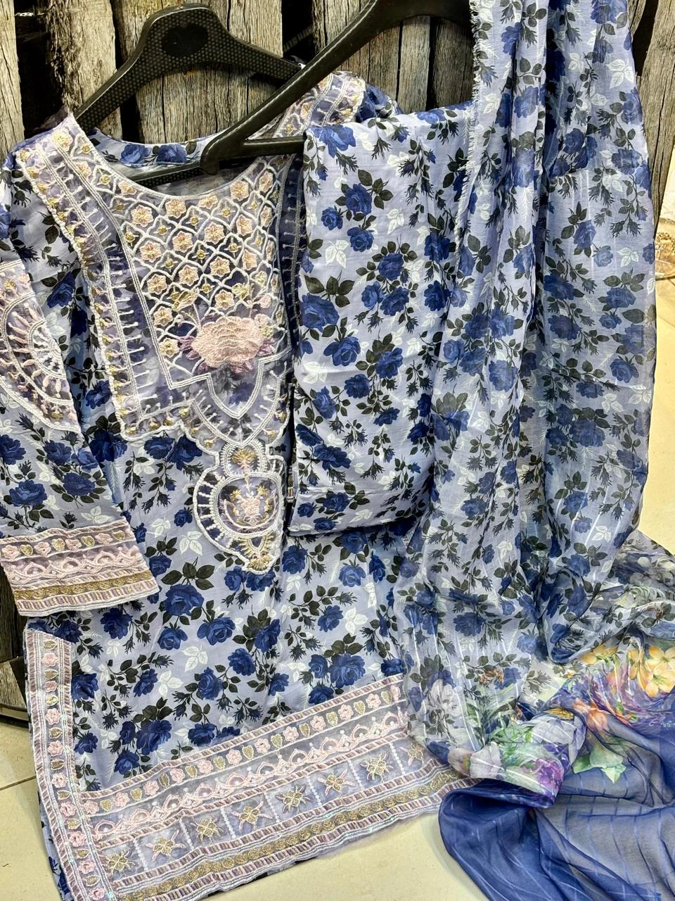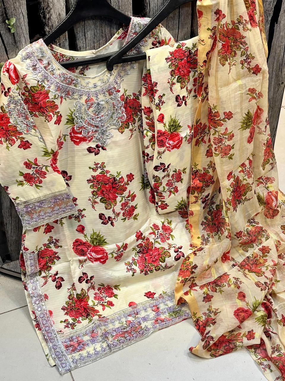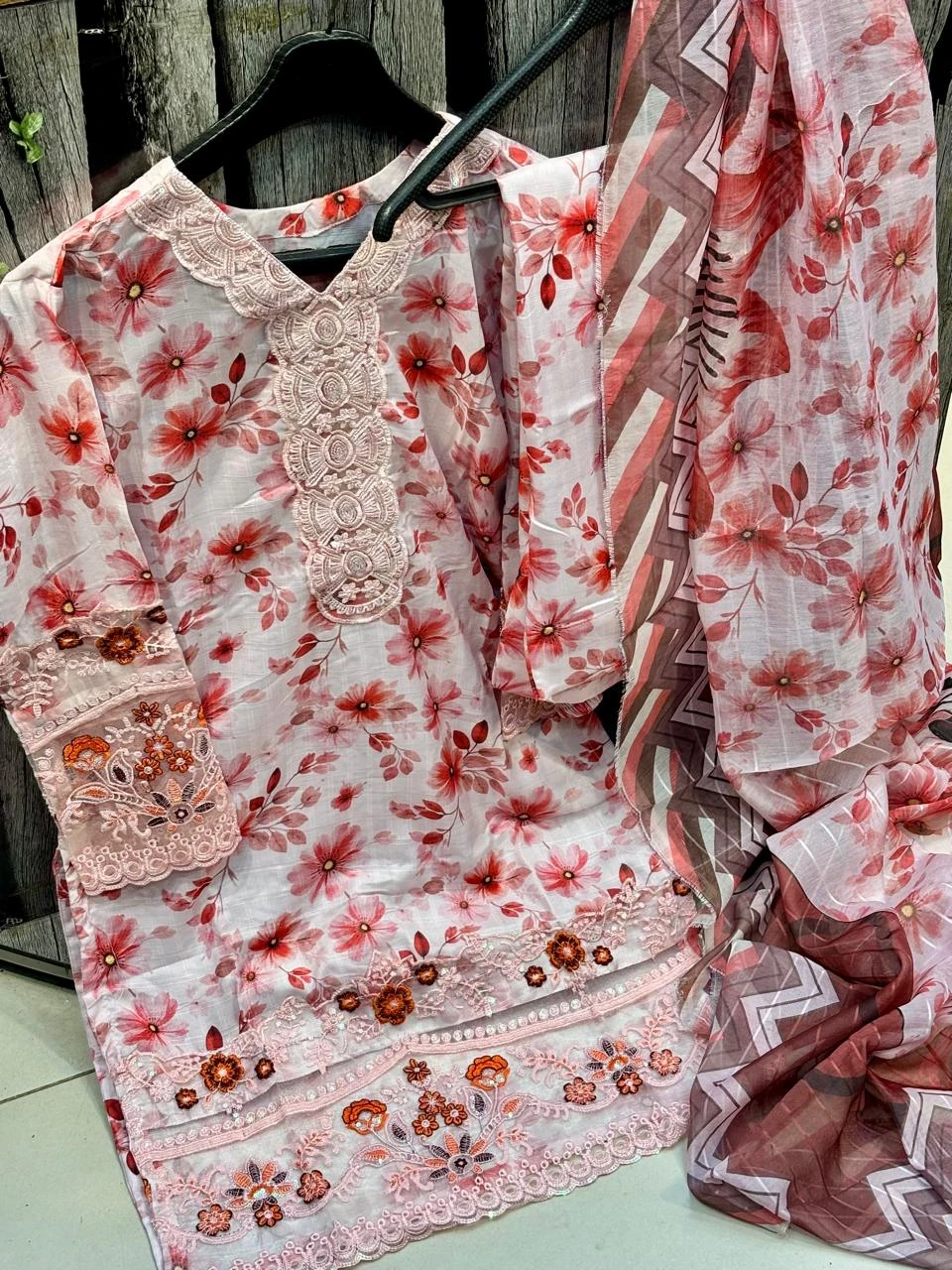 Doria Lawn Digital Printed Full Heavy Embroidered Shirt With Doria Lawn Digital Printed Farshi Shalwar & Munar Diamond Digital Printed Dupatta 3pc Dress 👗