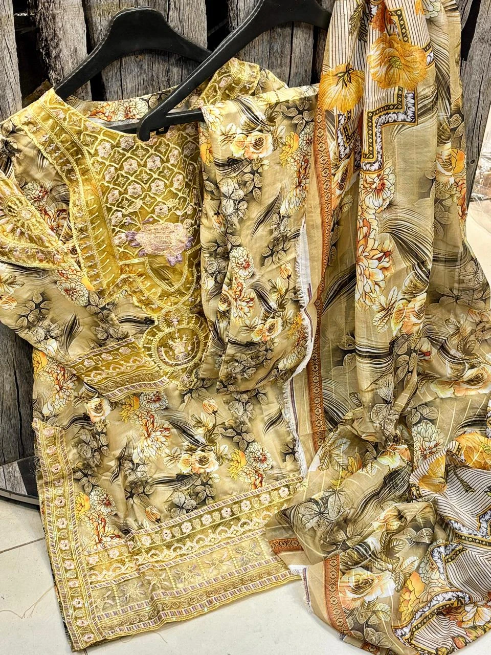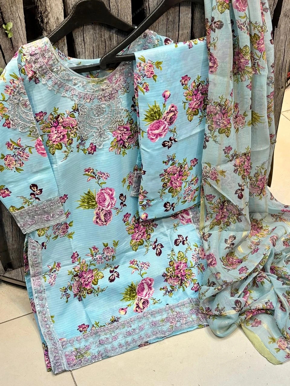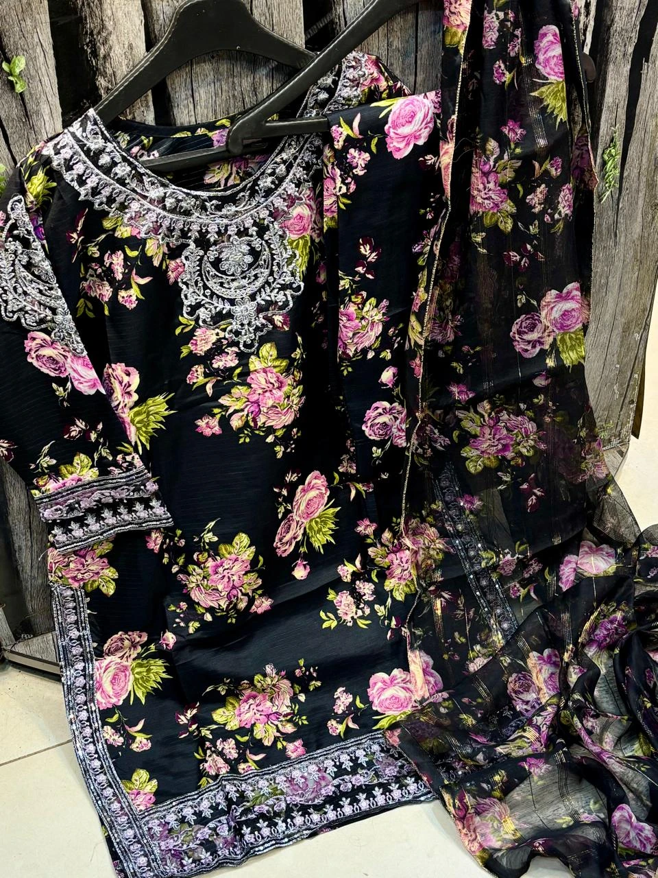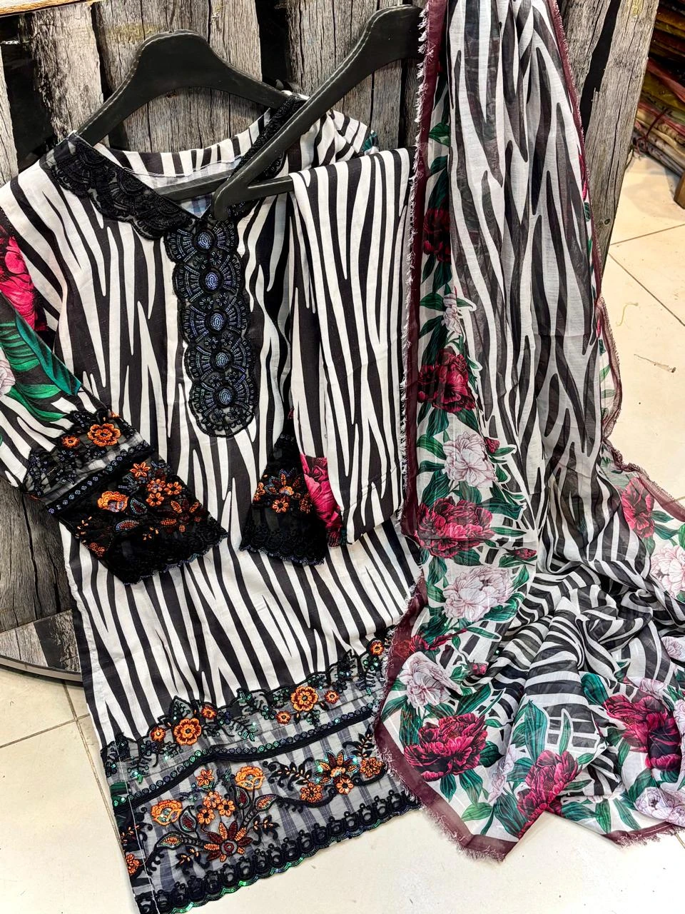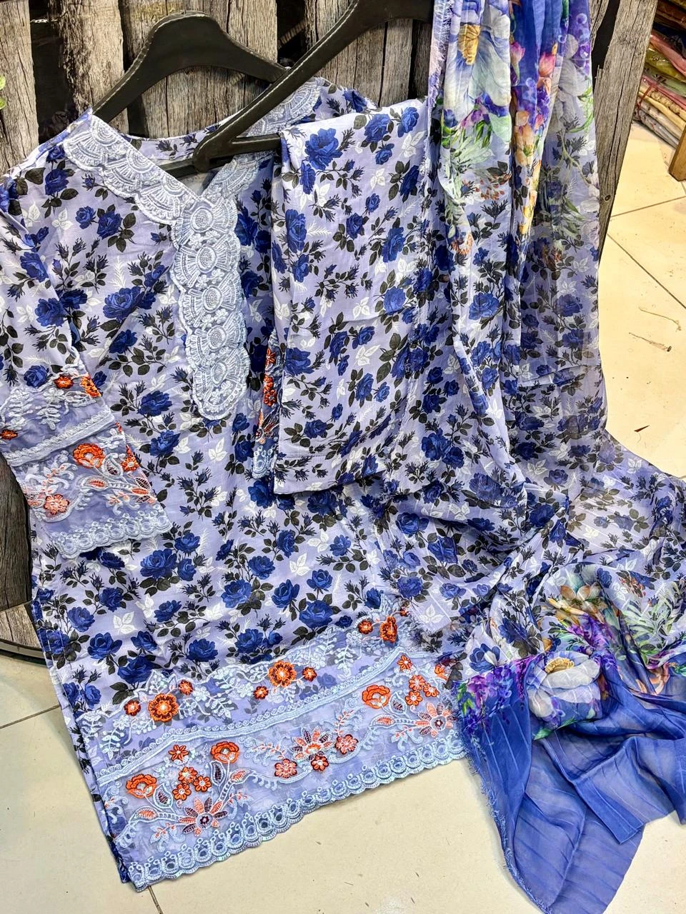 Doria Lawn Digital Printed Full Heavy Embroidered Shirt With Doria Lawn Digital Printed Farshi Shalwar & Munar Diamond Digital Printed Dupatta 3pc Dress 👗