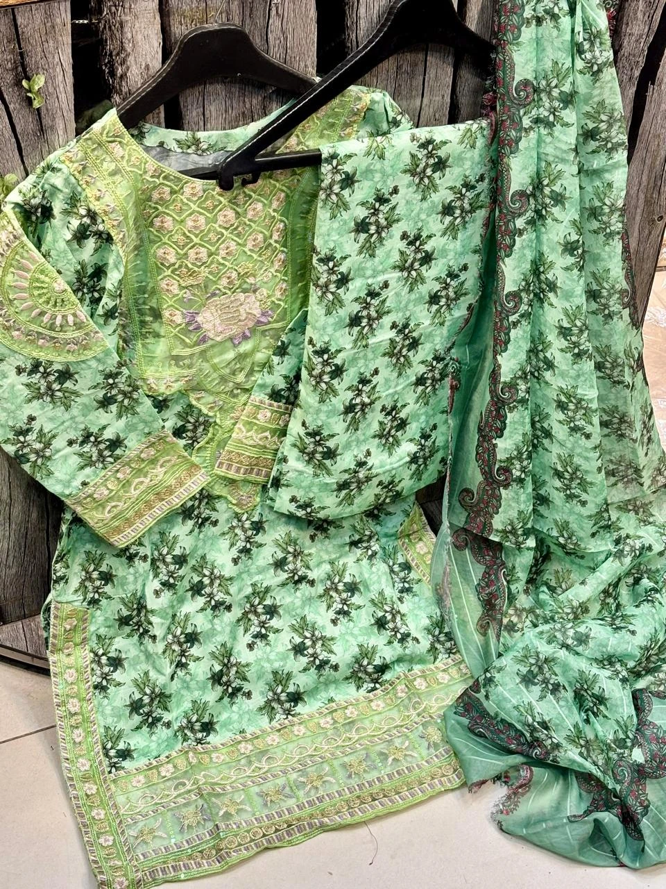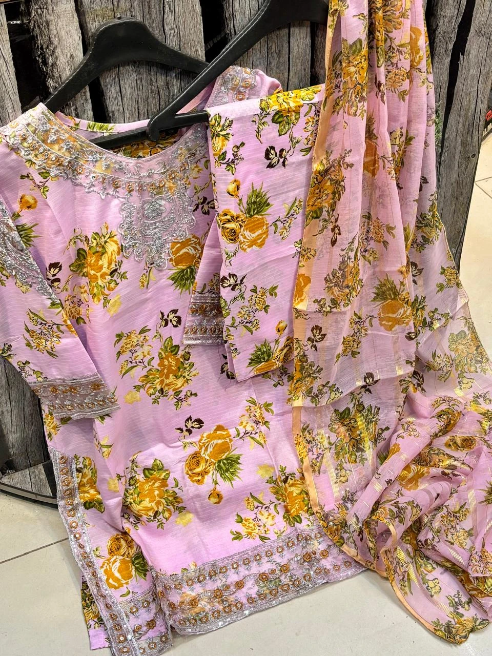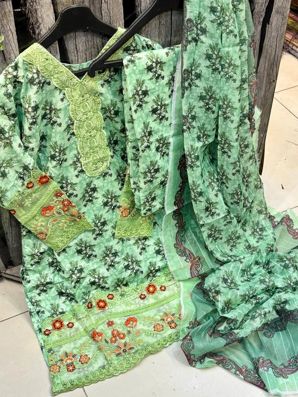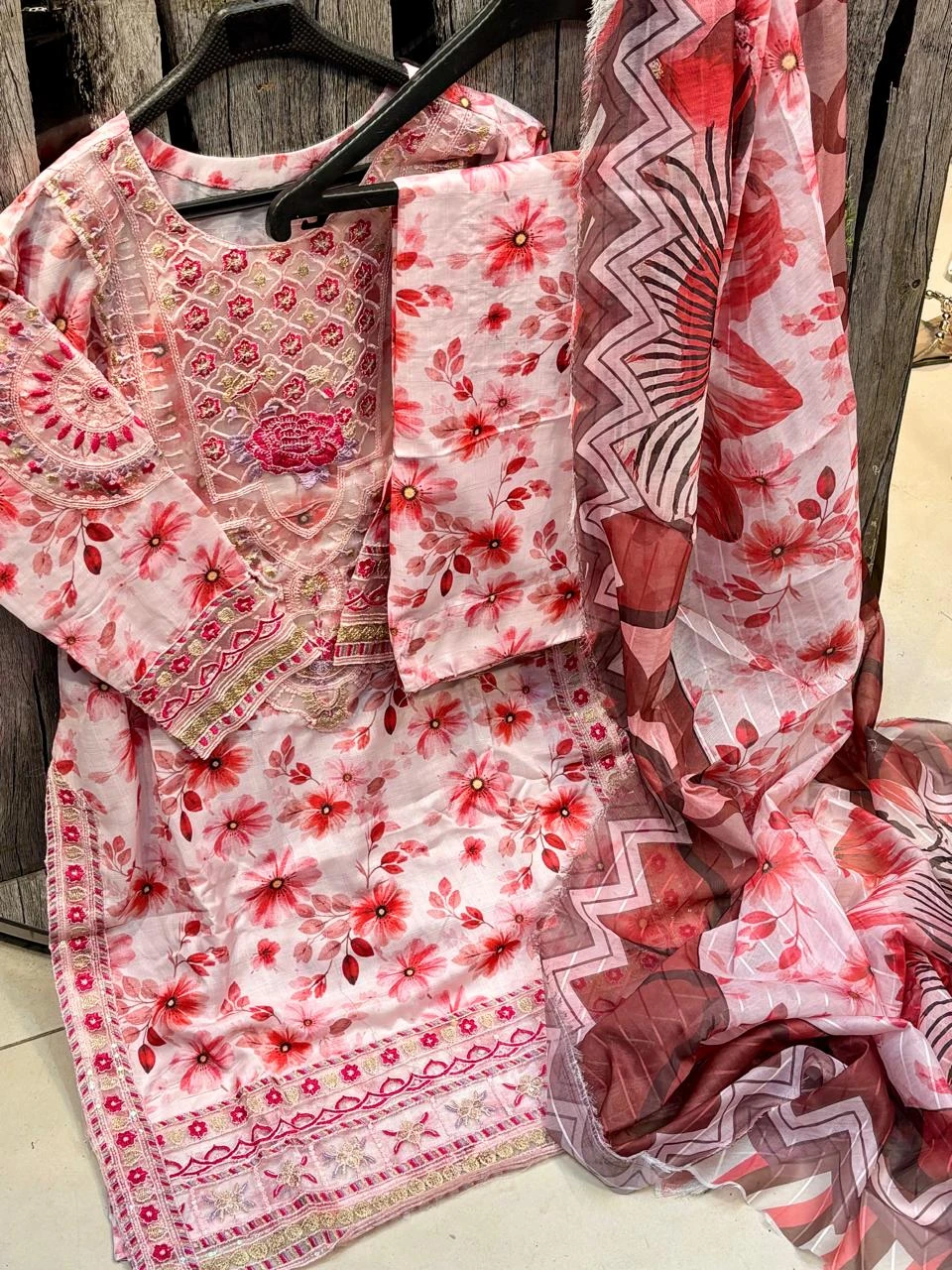 Doria Lawn Digital Printed Full Heavy Embroidered Shirt With Doria Lawn Digital Printed Farshi Shalwar & Munar Diamond Digital Printed Dupatta 3pc Dress 👗